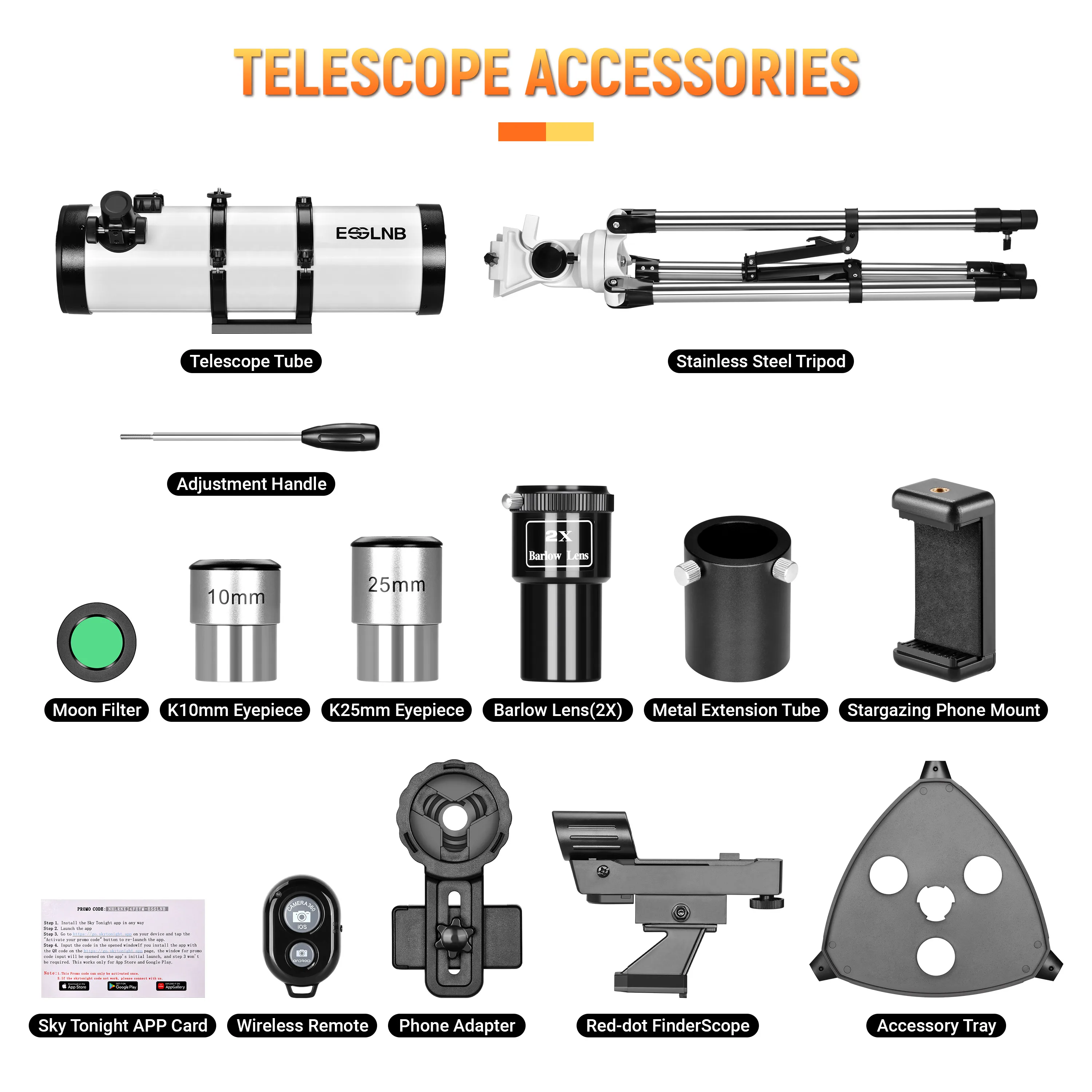 【Excellent Quality Optics】: It is equipped with two high-quality K25mm and K10mm eyepieces and a 2x Barlow lens, enabling magnification of between 26x and 130x. The red dot finderscope makes locating objects easy. The moon filter reduces glare and protects your eyes.