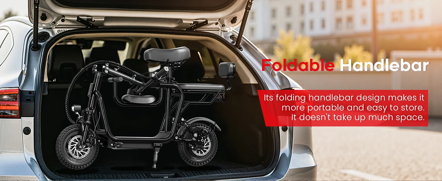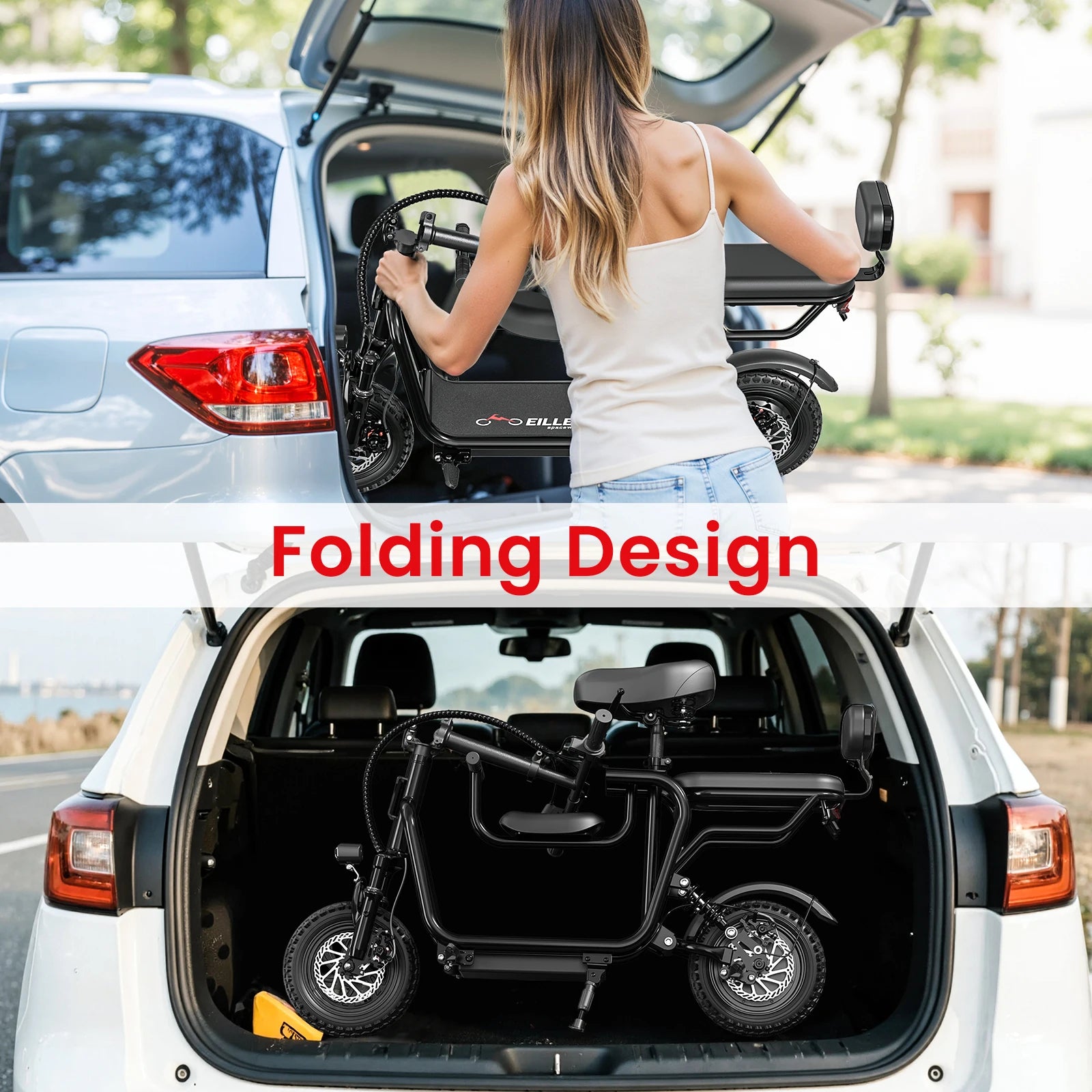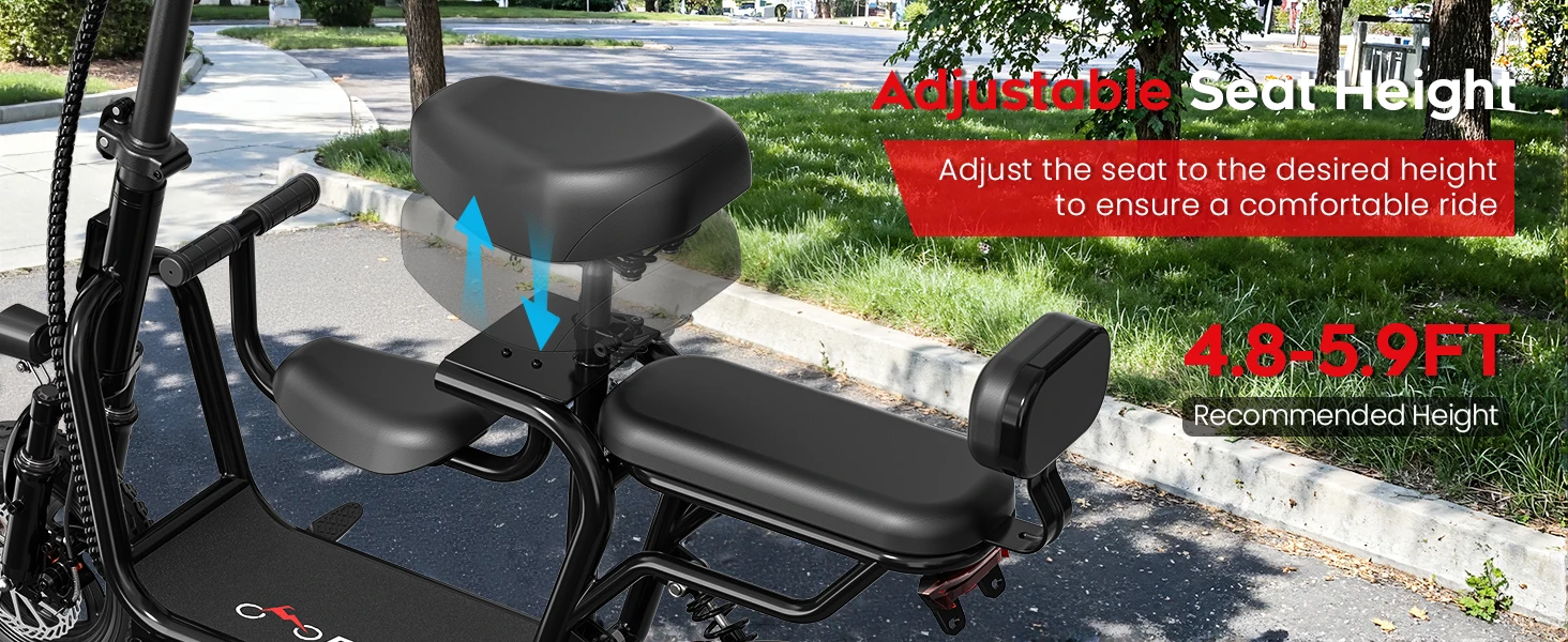 3 Seater: This adult electric scooter with seat features three seats: a removable child seat, a height-adjustable middle seat, and a removable rear seat that can carry two children and one adult simultaneously. It serves as a versatile electric commuter vehicle, as the front child seat can be removed to free up space for pets and cargo. Additionally, the rear seat can be removed to install a basket. It's perfect for commuting or short trips around campus. (Note: Basket sold separately)
