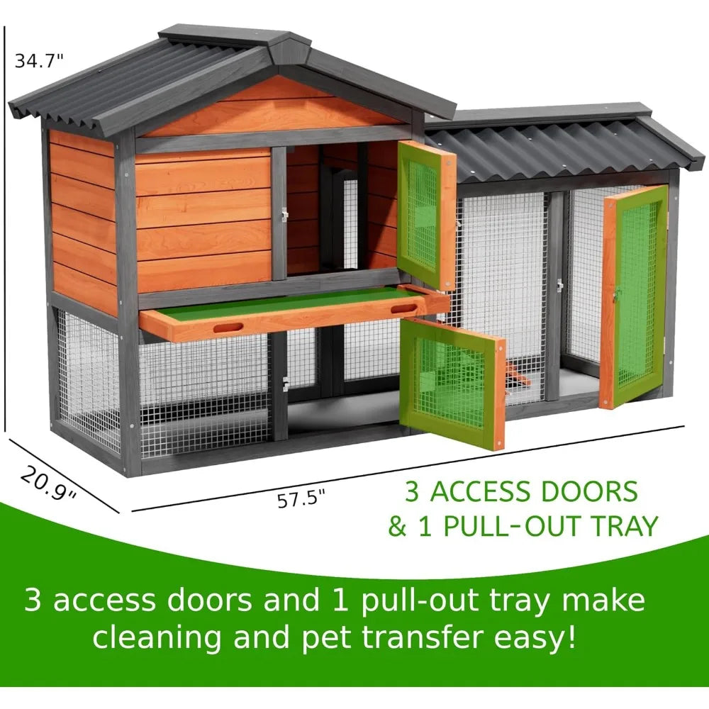 - Spacious, with a 57.5" L × 20.9" W × 34.7" H footprint, this 2-tier design offers roomy interior and all-weather use as a duck coop or chicken coop.