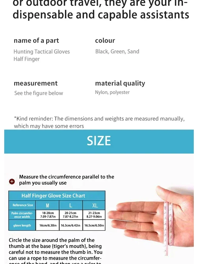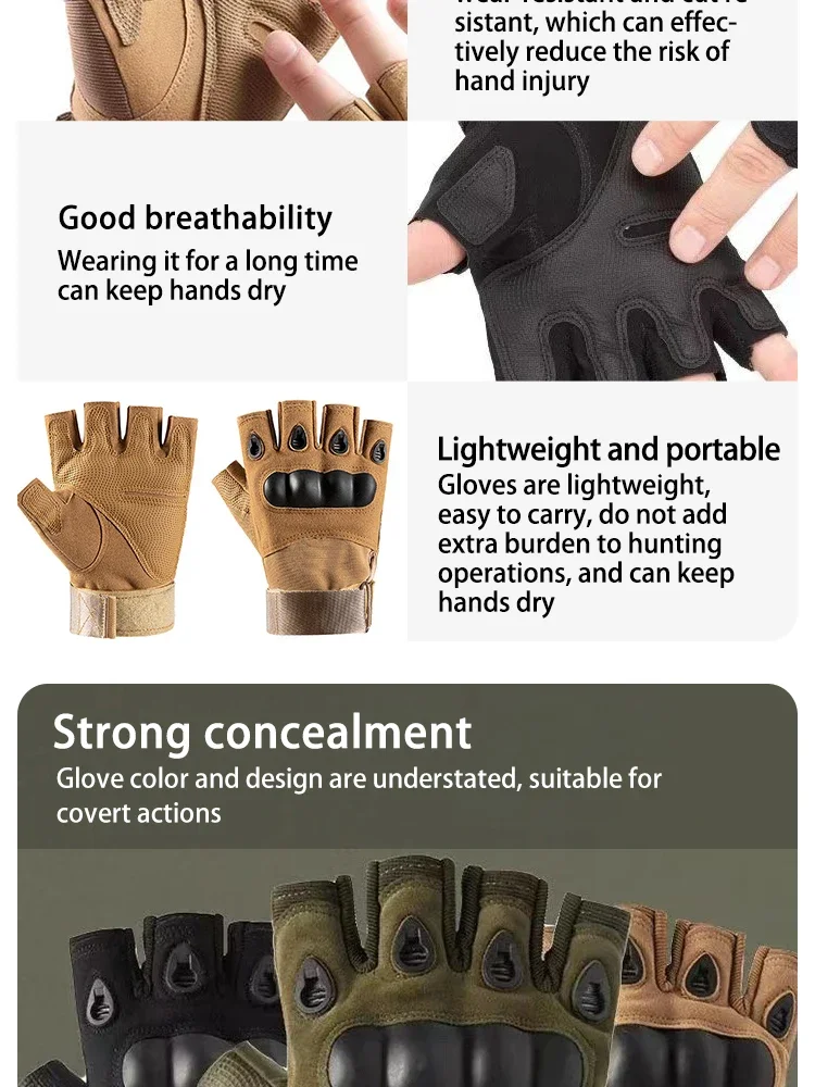 • 战术设计:这些手套专为户外狩猎而设计,采用半指设计,提供战术优势。