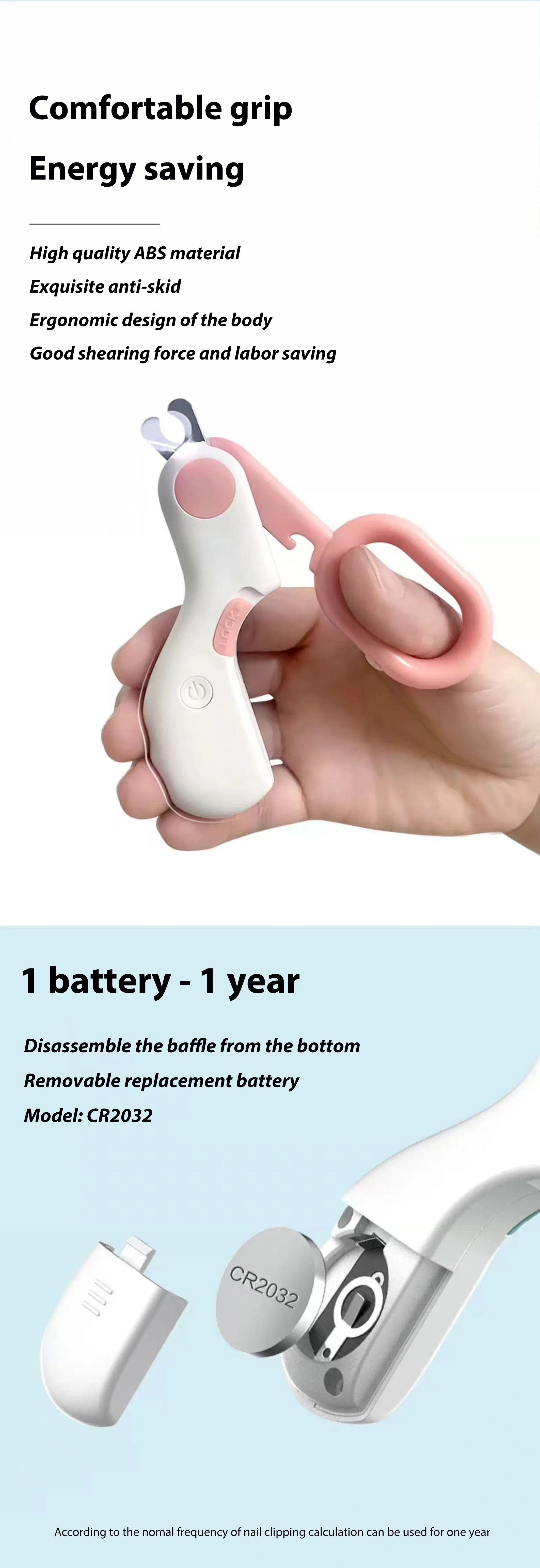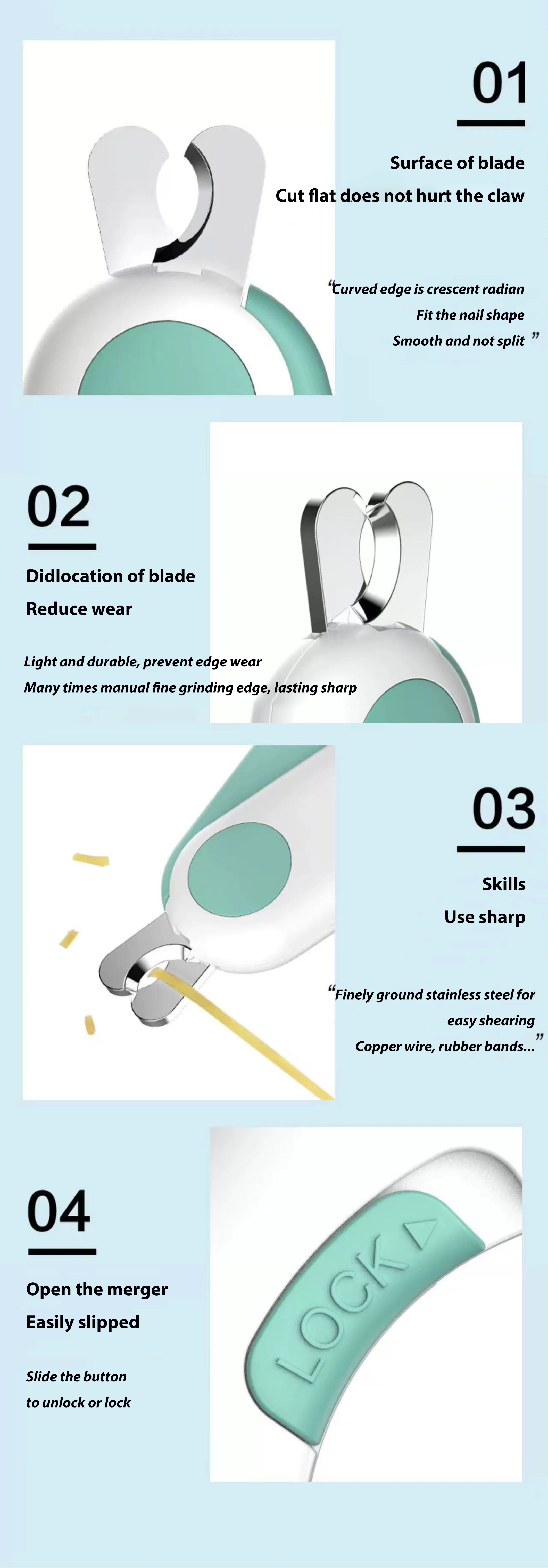 Safety Lock Feature :The safety lock feature ensures that the nail clipper can only be used by an adult, preventing accidental cuts and injuries to pets.