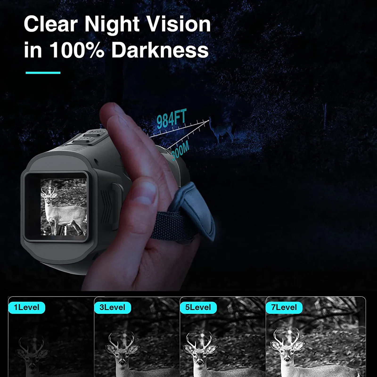 --Built-in 3W IR LED light: Night vision goggles with 850nm IR-illuminator allow you to clearly see targets 984 feet away in the dark without any ambient light. 7-bit adjustable IR design, adapt to different groups of people and different environments to obtain the best results.