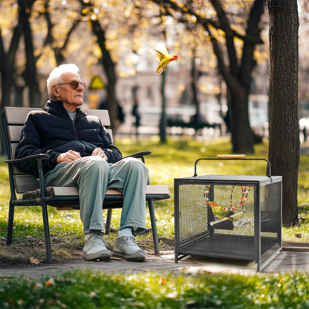 【Portable Bird Cage】This bird cage is thoughtfully designed to prioritize the comfort and well-being of feathered friends while offering conveniences and style for owners, equipped with a sturdy metal handle wrapped in a wooden grip for comfortable hold when carrying, whether you're taking birds to the vet, on a travel, or simply moving it around your home, this cage is versatile enough to meet all your needs.