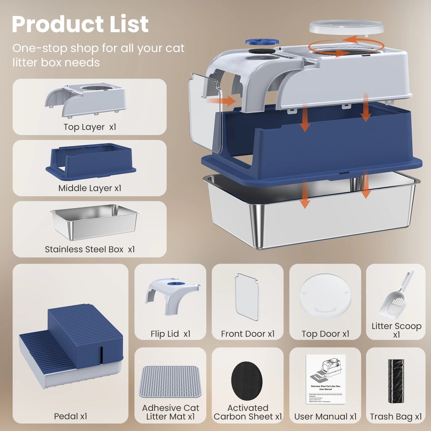 6.Practical Accessories IncludedComes with litter scoop, anti-scatter mat, and step-mounted trash bag slot – convenient to use & replace supplies.