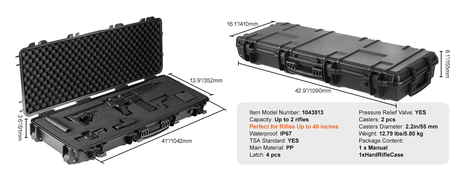 Sturdy & IP67 Waterproof: SucceBuy rifle cases are built to be impact-resistant, IP76 waterproof, and withstand extreme temperatures, making them ideal for diverse environments. Whether traveling long distances or engaging in outdoor activities such as hunting or shooting sports, our rifle hard cases effectively protect your firearm in demanding situations.