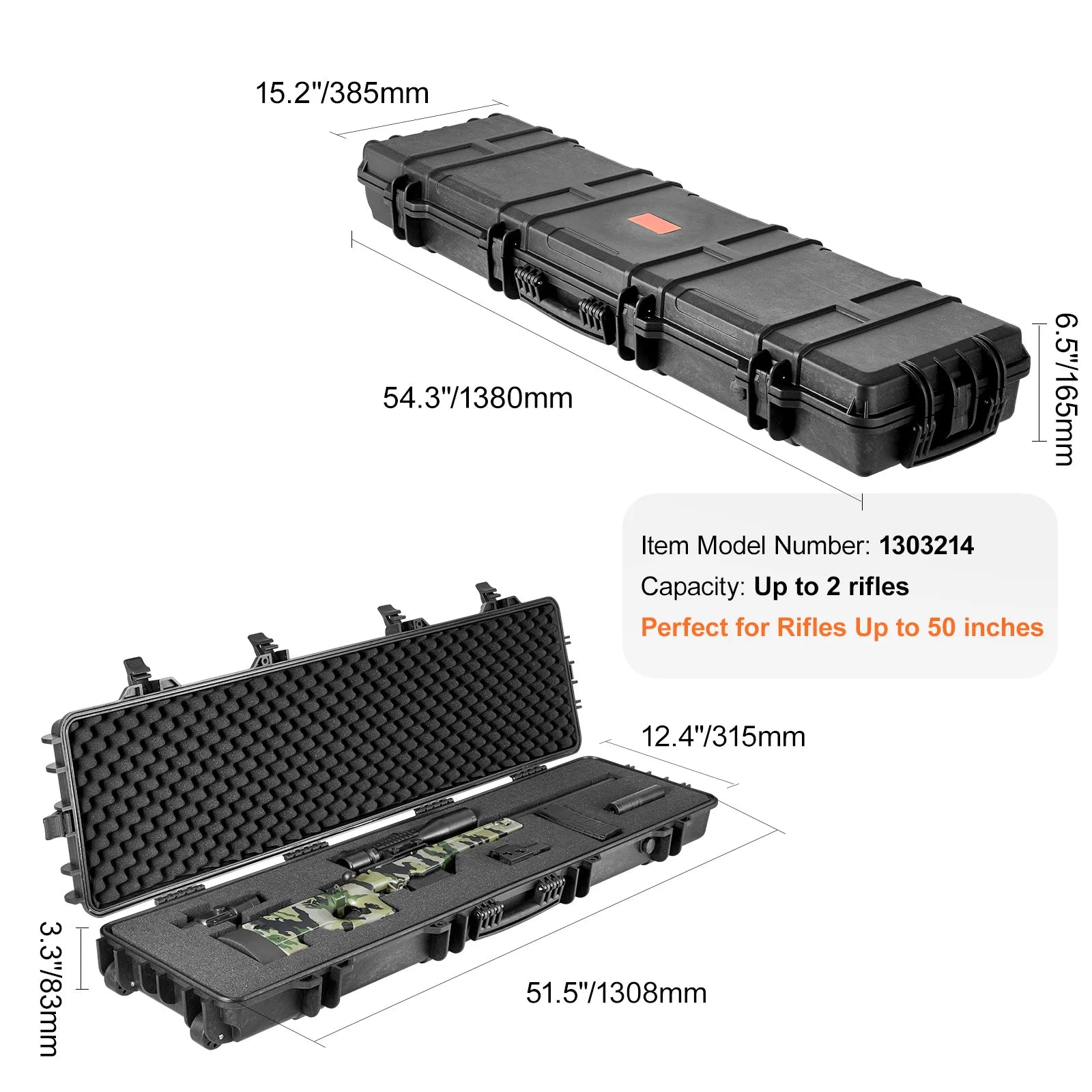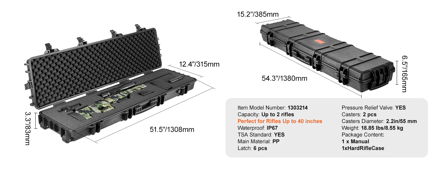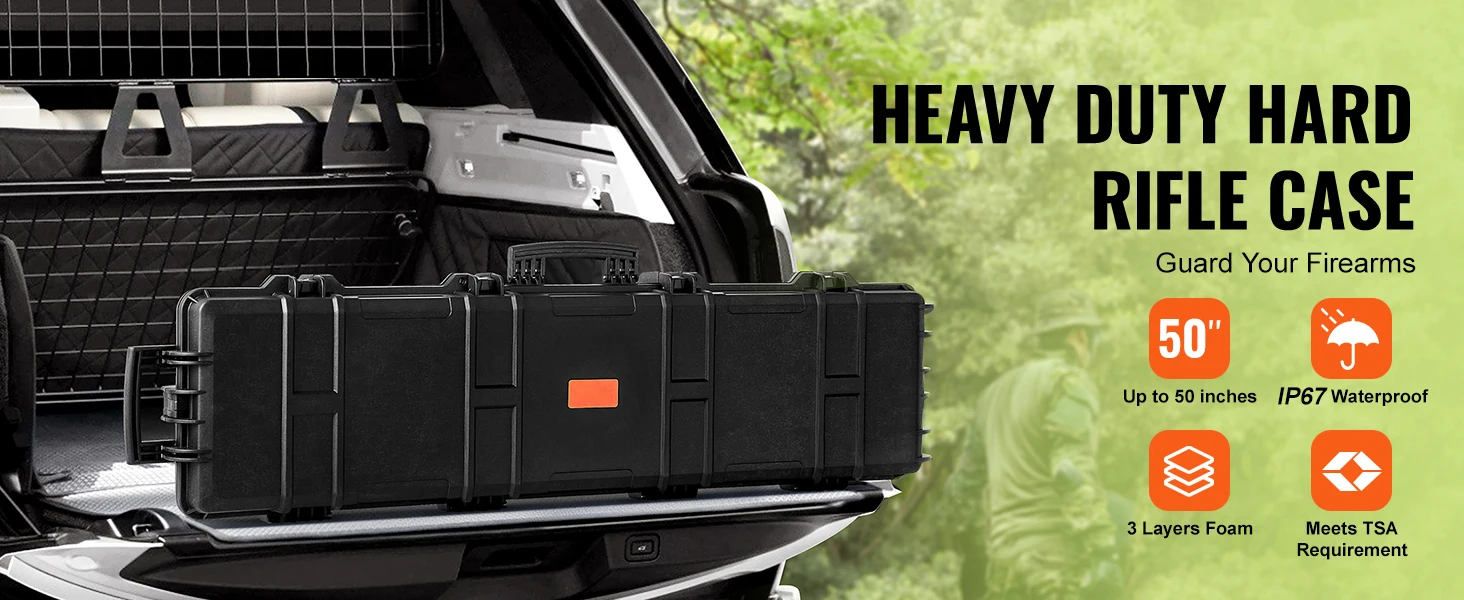 3 Layers Foam: Our rifle hard case includes three layers of soft foam to provide all-side protection. It consists of one layer of egg-crate foam padding for shock absorption, one fully customizable layer for a snug fit, and one solid foam layer for additional support. The maximum overall gun height accommodated by the case is 50 inches.