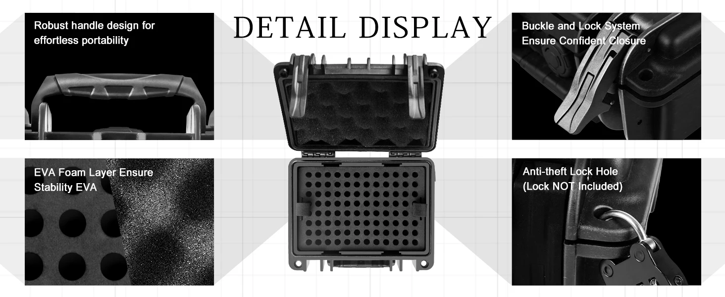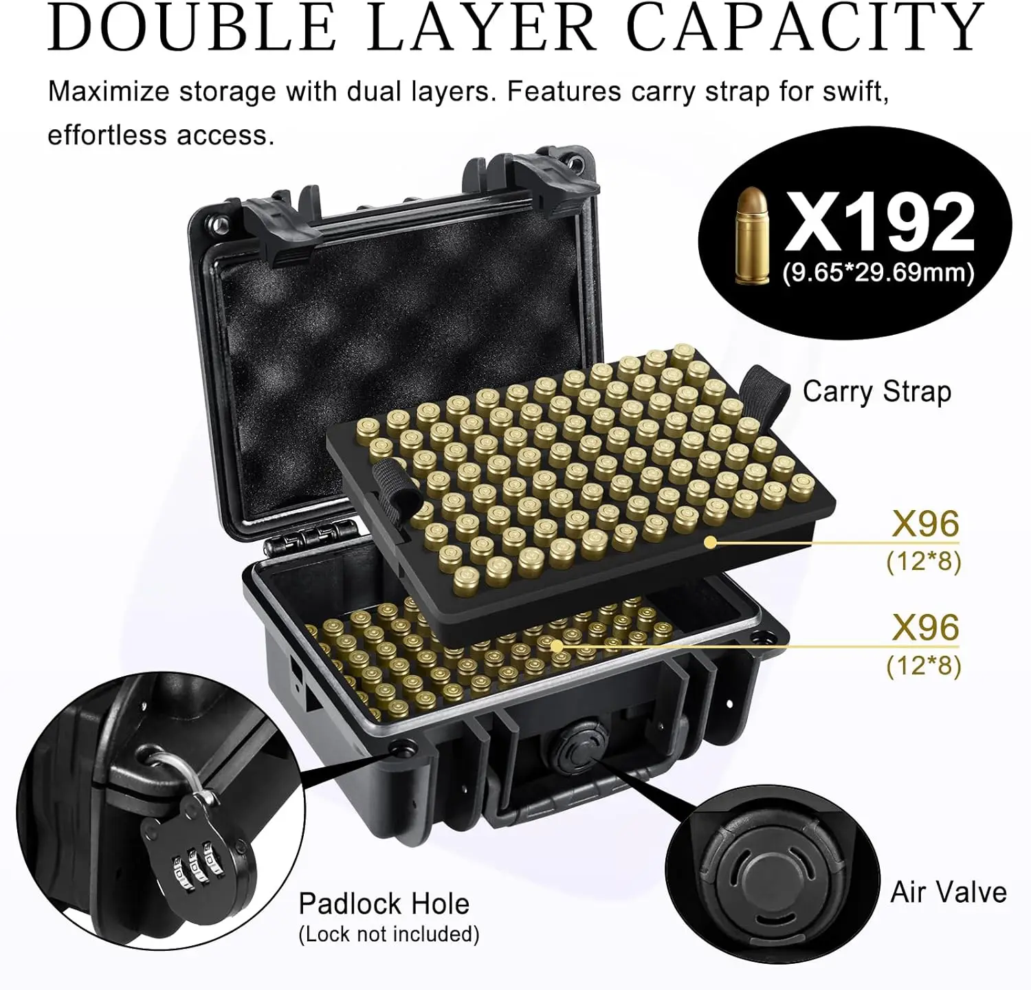 Both sides of the opening feature holes for locks (Lock not included), enhancing security and preventing unauthorized access to the ammunition. Our ammo case is equipped with a pressure valve, which allows you to regulate the opening and closing in high temperature or extremely cold environments.